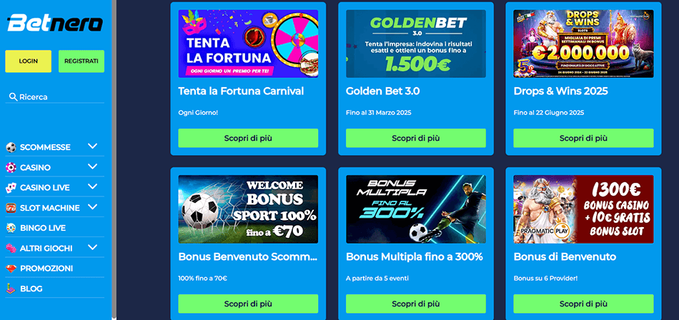 Il principale obiettivo della nostra guida è l’area sportiva di Betnero, che analizzeremo nel dettaglio considerando il palinsesto, le promozioni, i metodi di deposito e prelievo, l’assistenza clienti e i numerosi altri servizi che questo nuovo operatore offre ai propri utenti. Naturalmente, tratteremo brevemente anche le altre aree del sito Betnero, come il casino e i giochi di carte.