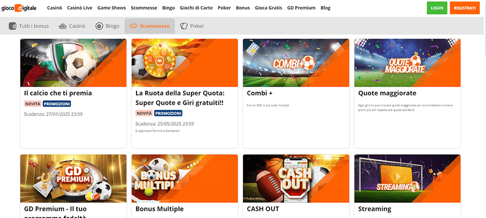 Nella stessa sezione trovate anche il link ai Combi+ Gioco Digitale scommesse: pronostici multipli che coinvolgono più squadre (ad esempio tre vincenti partite), anche questi con payout potenziati.